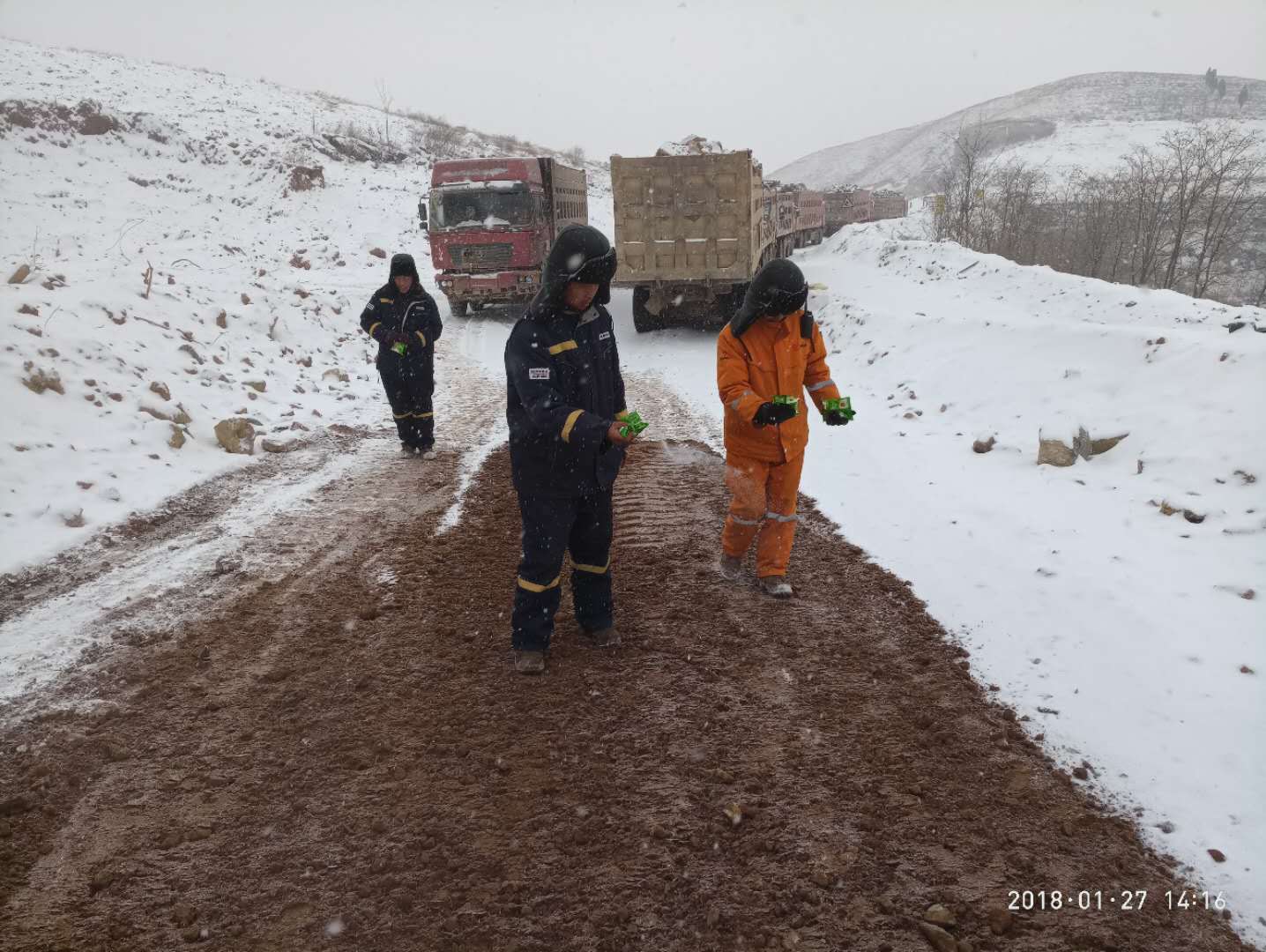 -----兗州中材禹州分公司趕工生產(chǎn)場記 雪花,仿佛在此迷了路,不知疲倦地,連續(xù)三天三夜,一片又一片,鋪天蓋地般伴隨著透骨的寒風(fēng),利刃似的迎面而來…… 數(shù)九寒天,持續(xù)低溫,千里冰封,萬里雪飄,整個世界好像變成了一只巨大無比的冰箱,山川冷地顫抖,路面凍地僵硬,就連空氣,似乎也要凝固起來。 安全生產(chǎn)大于天!已是寒冬臘月,年關(guān)將至,為了能在1月21日到2月10日為期20的天生產(chǎn)期限內(nèi)正常供礦,滿足水泥廠順利生產(chǎn)的需求,禹州分公司的全體員工們正夜以繼日、廢寢忘食的堅守在生產(chǎn)最前線。 面對糟糕天氣帶來的種種不利生產(chǎn)因素,他們沒有退縮,也沒有氣餒,更沒有逃避:冰天雪地,道路本來就滑得連走路都異常謹慎、艱難,而被運輸車輛來來回回碾壓過的運礦道路更是如履薄冰!安全隱患不容小覷,及時、合理、有效的解決措施更是刻不容緩!現(xiàn)場管理人員迅速調(diào)動裝載機用土石鋪墊路面。 然而,剛剛鋪好的“安心”路面很快又被不停飄落的雪花覆蓋了、掩埋了,大家又立即采取了人工往運礦道路上撒鹽的辦法來融雪化冰,以達到安全生產(chǎn)、穩(wěn)產(chǎn)的目的。 緊繃安全生產(chǎn)的琴弦,現(xiàn)場管理人員們時刻眼觀六路,耳聽八方,腳不停歇。白茫茫的礦山上時不時走動著這些忙碌的可愛“雪人們”,他們在認真負責(zé)地指揮挖機師傅如何合理挖裝;他們在耐心十足的警醒汽車司機放慢車速、平穩(wěn)倒料、安全第一;他們再仔細檢查、巡視每一個可能出現(xiàn)安全紕漏的角落。 大地一片銀白,一片潔凈,夜已很深,而雪花,仍如柳絮,如鵝毛,如棉花,從無邊無際的天空中不知倦怠的飄飄灑灑,寒風(fēng)怒吼著呼嘯而過,低溫仍在繼續(xù)發(fā)酵!天寒地凍里,不畏嚴寒風(fēng)霜,不懼艱難險阻、勇于吃苦耐勞的禹州分公司的全體員工依舊未眠,他們正用滿腔的青春熱血和積極飽滿工作熱情來燃燒、來暖化這萬里冰山...... 兗州中材建設(shè)有限公司禹州分公司 2018年1月27日 |