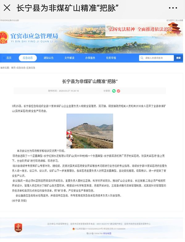 3月25日,宜賓市長寧縣應急局組織全縣11家非煤礦山企業(yè)負責人和安全管理員、雙河鎮(zhèn)以及硐底鎮(zhèn)政府相關人員共計30余人召開了全縣非煤礦山(露天采石場)安全生產(chǎn)現(xiàn)場會。 長寧縣應急局邀請兗州中材長寧分公司作為全縣非煤礦山的正面典型為參會企業(yè)分享開采經(jīng)驗。 上午9點參會人員到達長寧分公司―紅獅水泥礦山現(xiàn)場,分公司員工與業(yè)主接待了到場的市縣領導以及企業(yè)參會人員。同時嚴格按照防疫要求進行體溫測量,人員信息登記入場。   9:30分全部人員到齊,由長寧分公司職工帶領大家參觀礦山現(xiàn)場,為參觀人員介紹礦山整體情況,相關開采技術(shù),并解答參觀人員提出的問題。    10:30參觀結(jié)束,參觀人員對于此行都感到滿意,我們的礦山工作也得到了大家的認可,相關同仁們都紛紛表達此行收獲甚多。 現(xiàn)場參觀學習結(jié)束后,當天下午召開了室內(nèi)培訓會,培訓會邀請了市專家?guī)鞂<遥瑫r長寧分公司職工葉剛同志很榮幸在受邀之列。 針對于非煤礦山安全開采等技術(shù)問題,兗州中材長寧分公司作為正面企業(yè)給參會企業(yè)分享了好的經(jīng)驗,同時也從會議中汲取了其他好的經(jīng)驗方法。 3月27日,宜賓市應急管理局報道了此次會議。此次會議中市縣領導高度評價了兗州中材長寧分公司的礦山開采工作,同時被市縣領導評為正面典型我司感到很榮幸。在此后的工作中我們要更努力,爭取更大的進步,樹立好我們的企業(yè)形象。 |