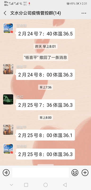 3、利用微信建群,做好公司疫情信息的搜集統(tǒng)計與分析工作,每日報告體溫由專門負責(zé)人統(tǒng)計信息并報送總公司、業(yè)主、當(dāng)?shù)赜嘘P(guān)部門。