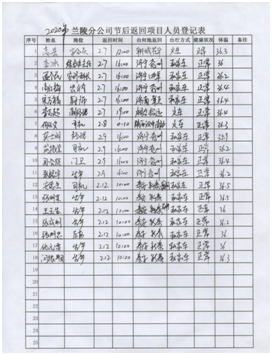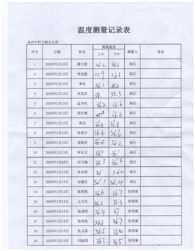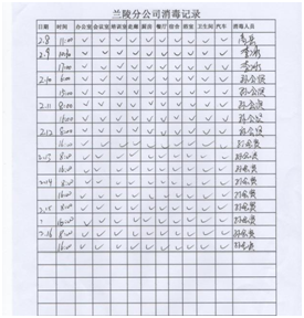 配合當(dāng)?shù)卣w溫監(jiān)測(cè) 落實(shí)措施,扎實(shí)開展防控工作。分公司設(shè)立疫情防控點(diǎn),配備防護(hù)口罩、手套、防護(hù)鏡、體溫計(jì)及測(cè)溫槍、酒精、84消毒液、噴霧器等防護(hù)物資。嚴(yán)格控制返程人員,對(duì)居住或經(jīng)過(guò)疫情防控重點(diǎn)區(qū)域人員,要求暫不返回項(xiàng)目部,居家隔離自我觀察;要求返回項(xiàng)目部人員,返程路上嚴(yán)格落實(shí)個(gè)人防控措施,制定記錄表,對(duì)返回人員嚴(yán)格檢查、登記;返回項(xiàng)目部后,在項(xiàng)目部?jī)?nèi)自行隔離14天,每天早晚測(cè)量體溫并做好記錄。    返程人員登記 每日體溫監(jiān)測(cè) 集中開展項(xiàng)目部衛(wèi)生消毒工作。分公司通過(guò)多種渠道,購(gòu)進(jìn)酒精、84消毒液等藥品,每天上午下午各進(jìn)行一次集中消毒工作,辦公室、會(huì)議室、廚房、餐廳、宿舍、衛(wèi)生間、走廊、院內(nèi)邊邊角角,全面消殺。  項(xiàng)目部消毒 消毒記錄