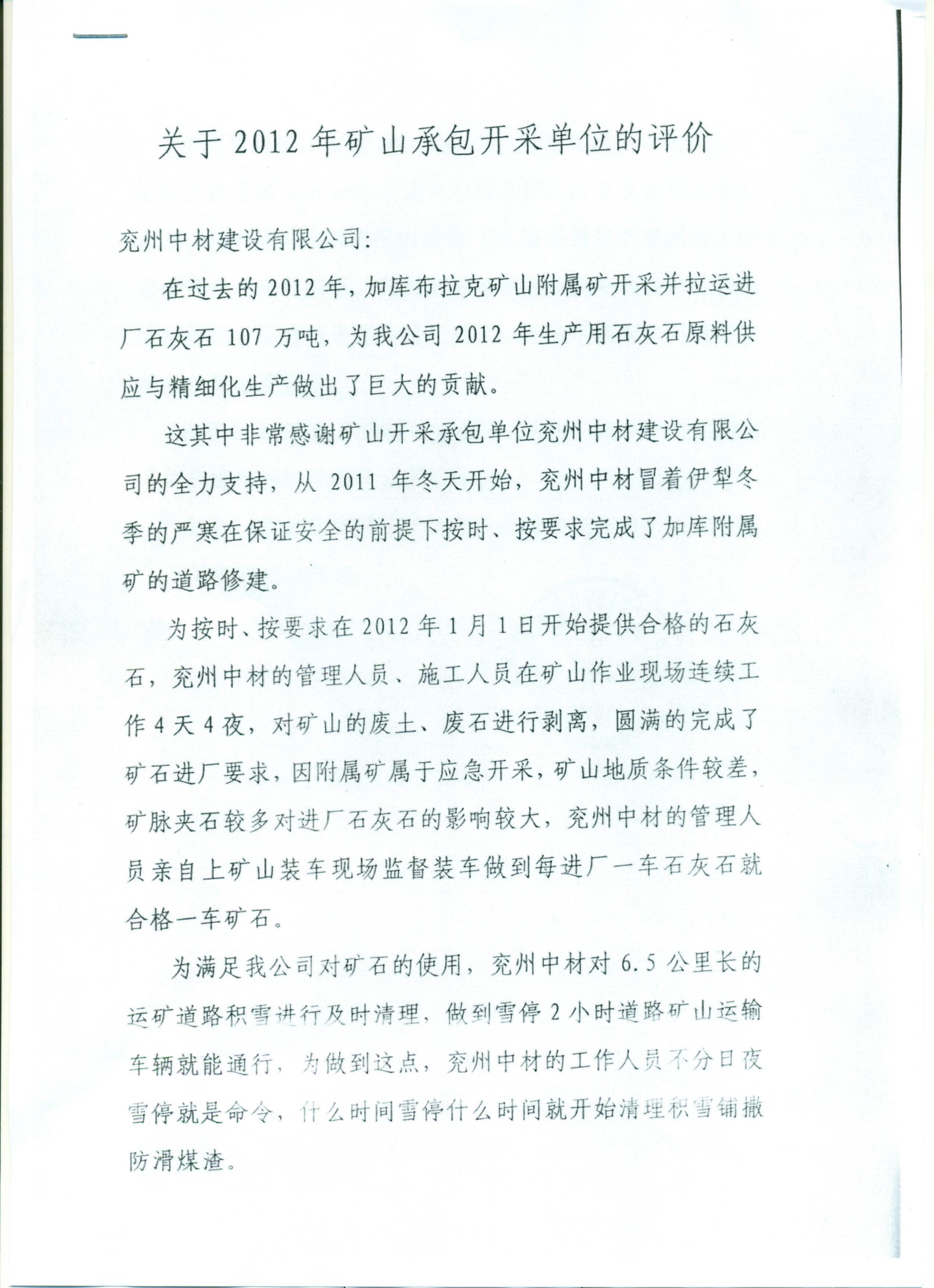 伊犁天山水泥有限責(zé)任公司對2012年礦山開采承包單位的評價