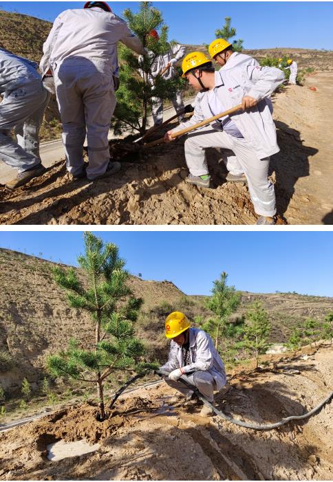 活動現(xiàn)場,員工們分工合作,熱情高漲。揮鍬、挖坑、培土、種樹、澆水……經(jīng)過大家的辛勤勞動,一棵棵新栽樹苗迎風而立,給礦山增添一片新的綠色生機。