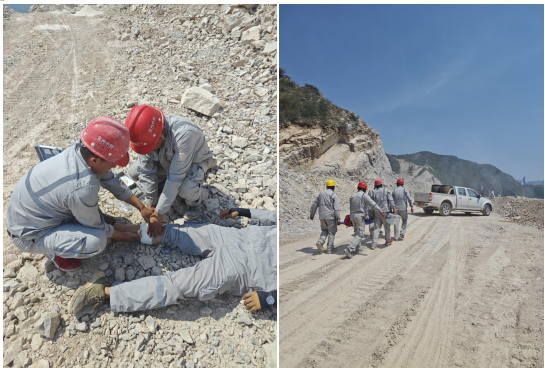 此次演練是模擬爆破后,爆破作業(yè)人員進(jìn)入爆破作業(yè)區(qū)域確定是否有無盲炮,由于爆破震動產(chǎn)生巖體松動,爆破作業(yè)人員躲閃不及被落石砸傷,導(dǎo)致無法起身。事故發(fā)生后,分公司立即上報并啟動放炮事故應(yīng)急預(yù)案,循序開展救援。